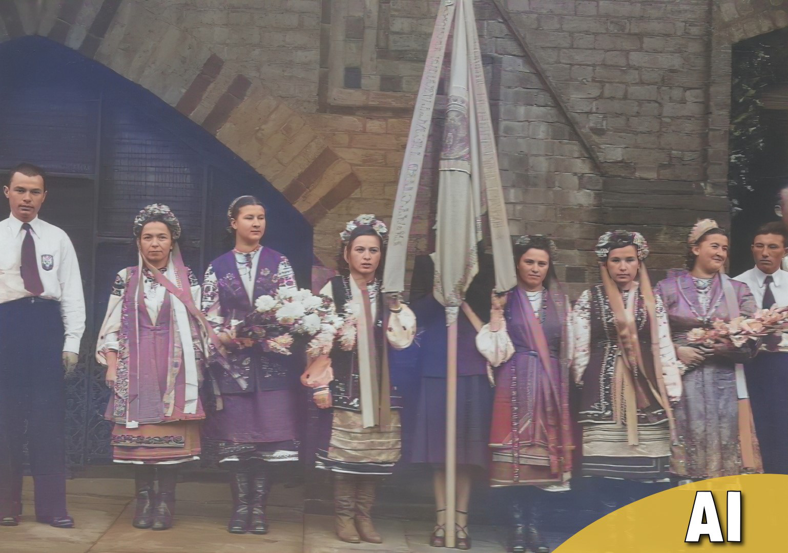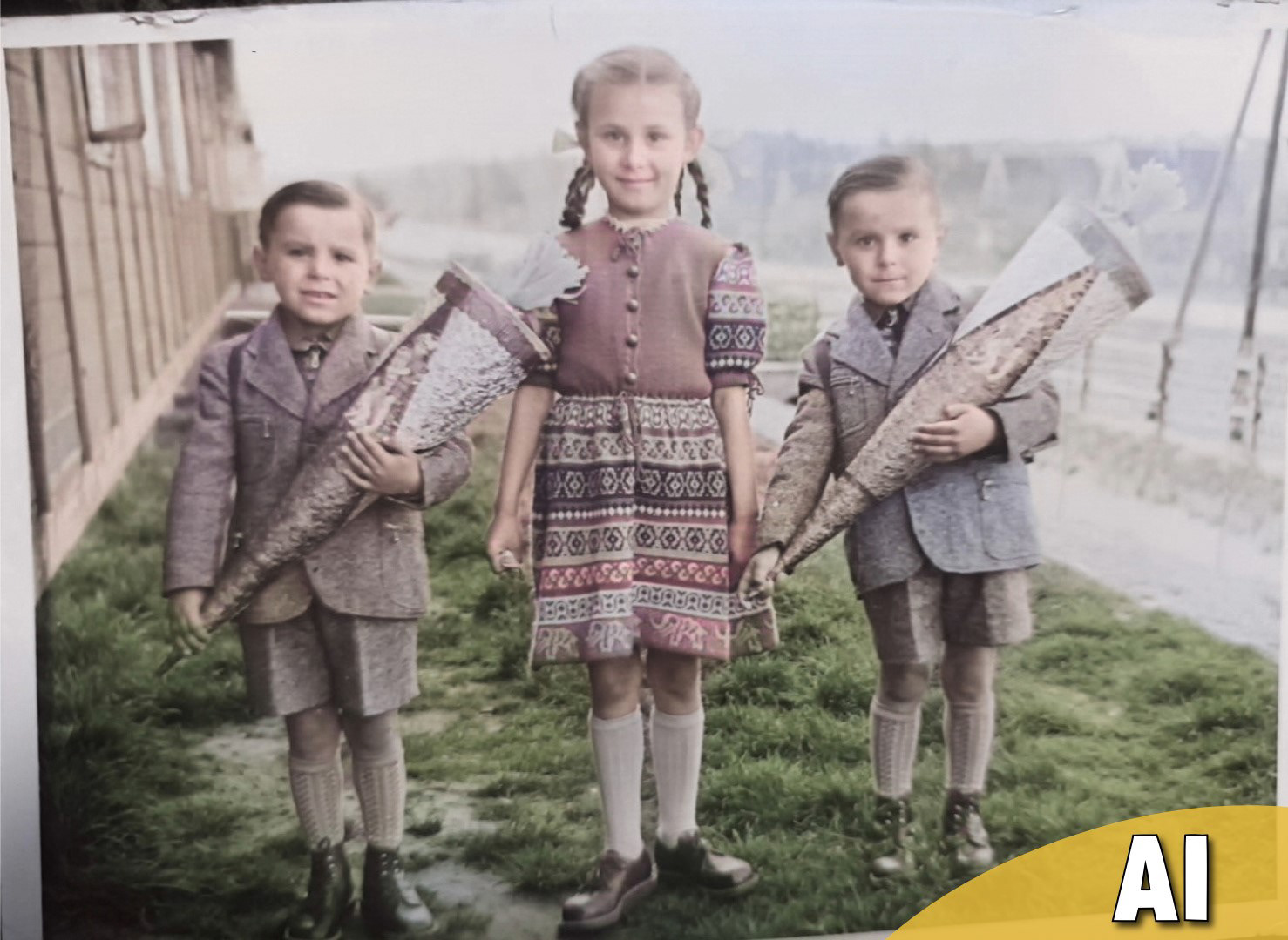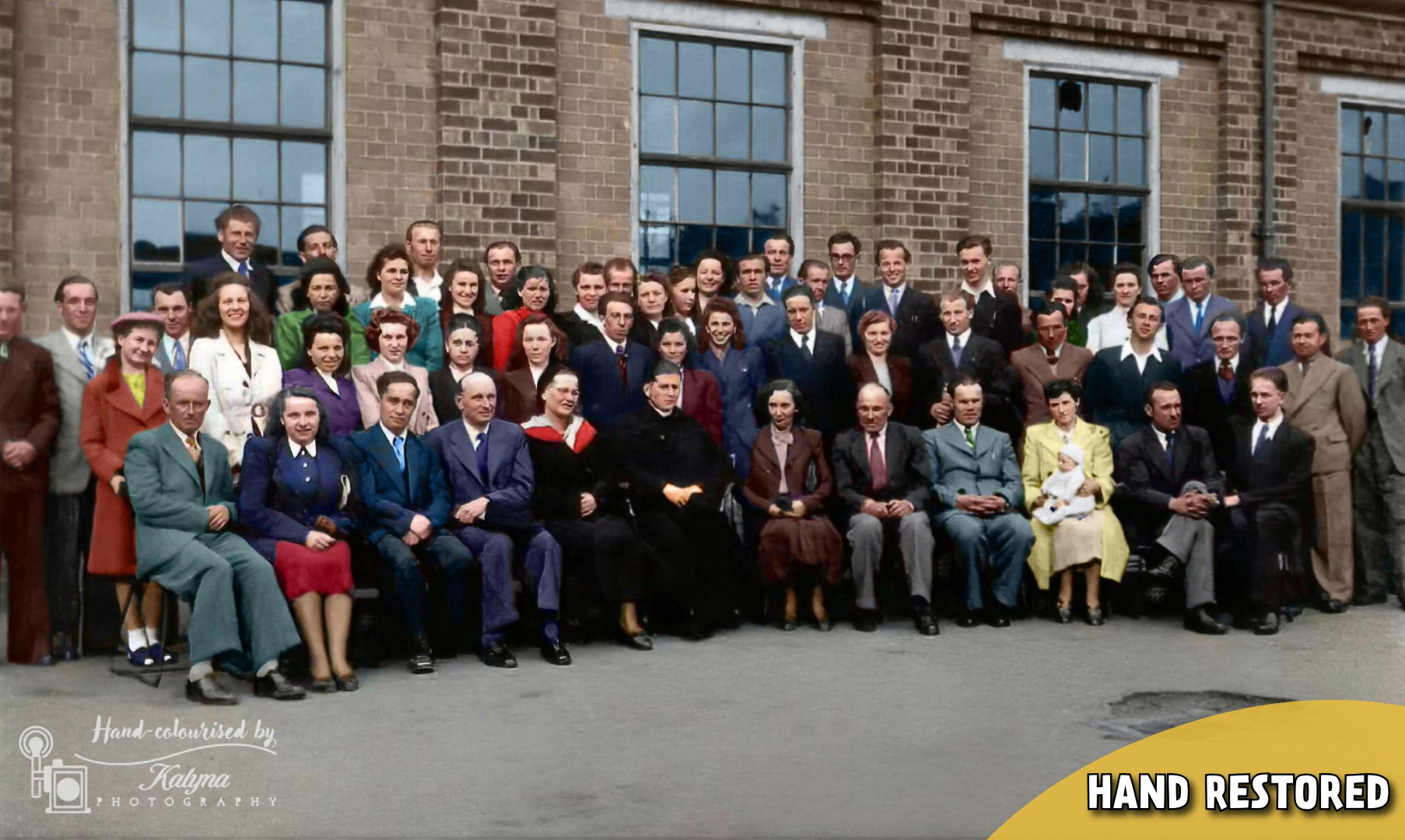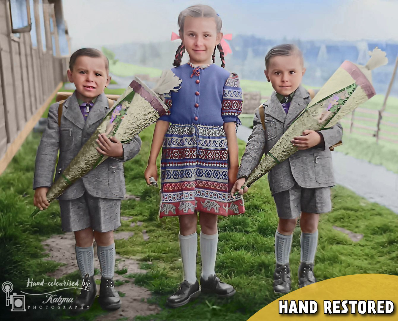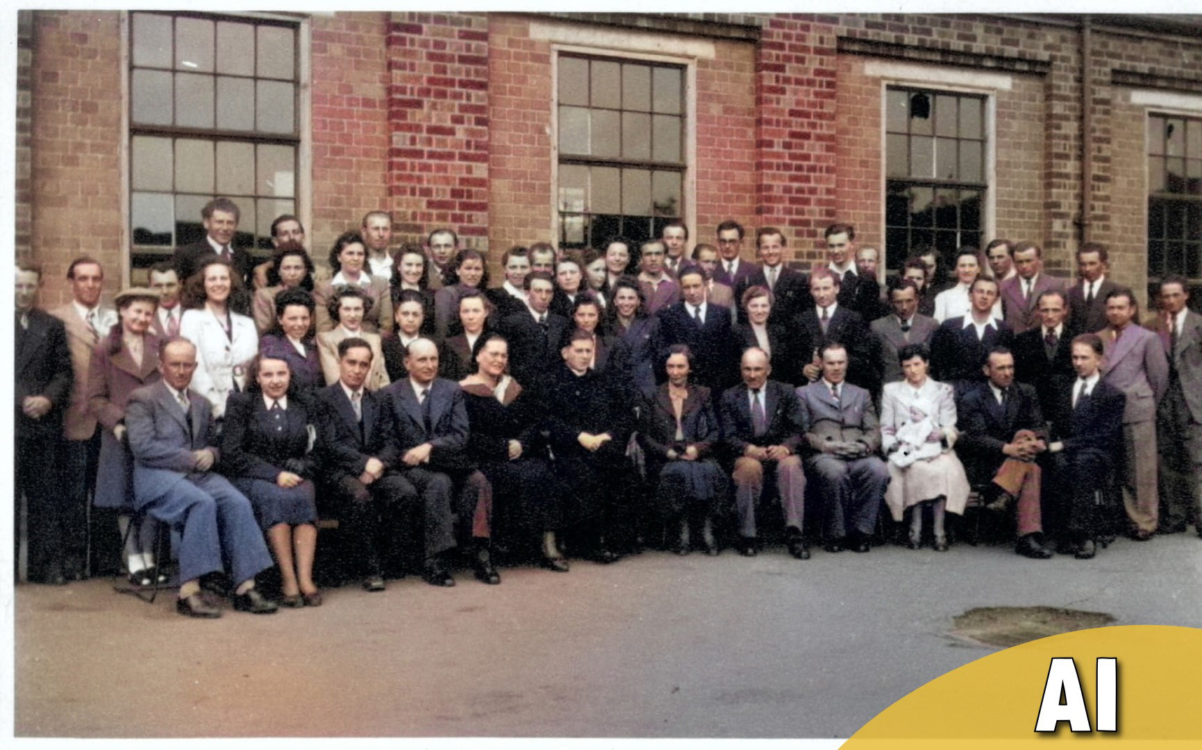 Transformation from the original monochrome image, an example of the AI automatic colourisation, to the hand-restored and hand-colourised end product
