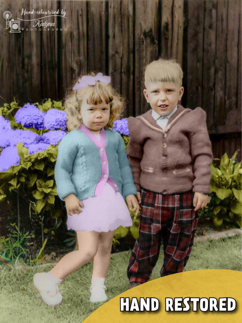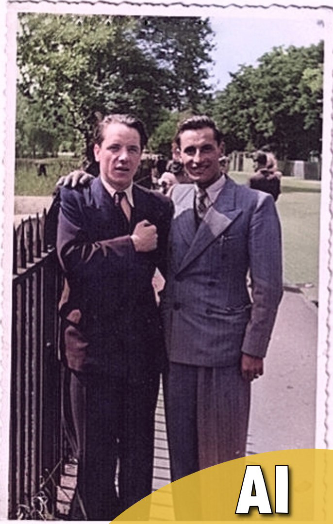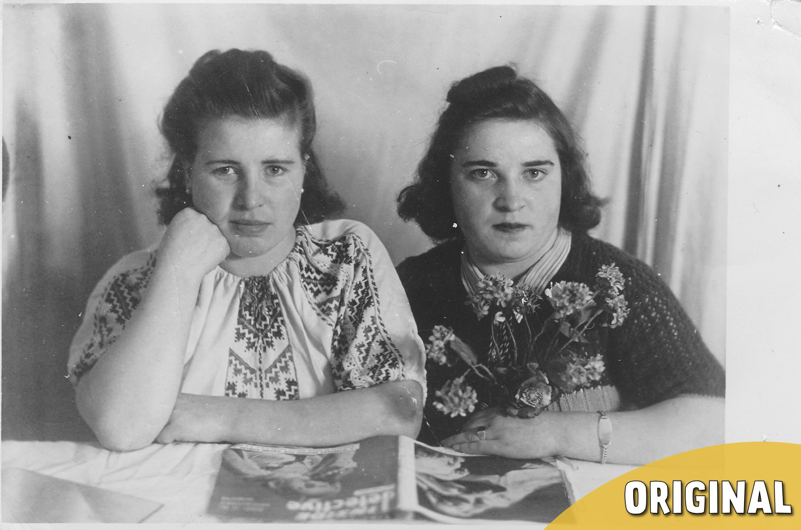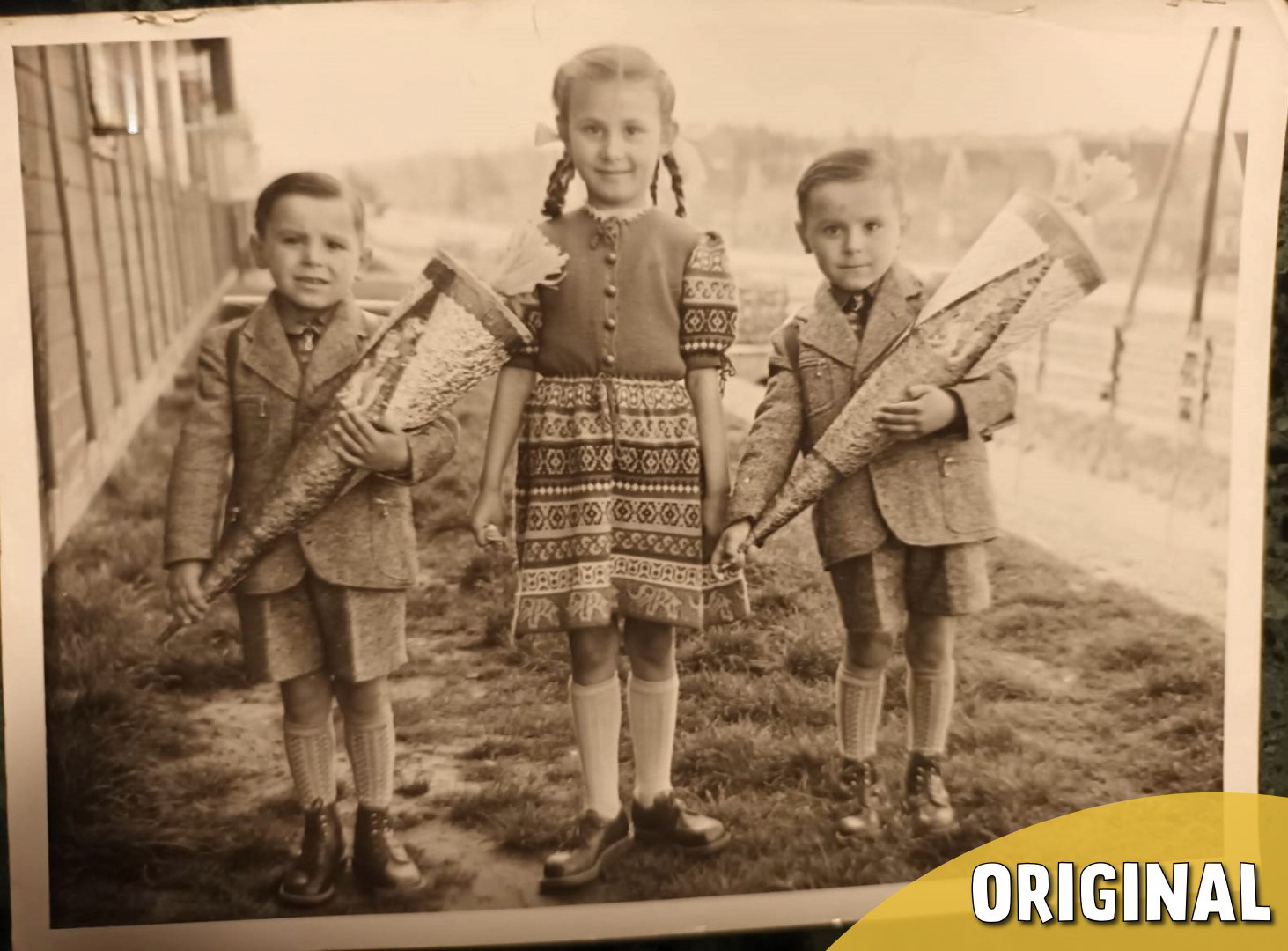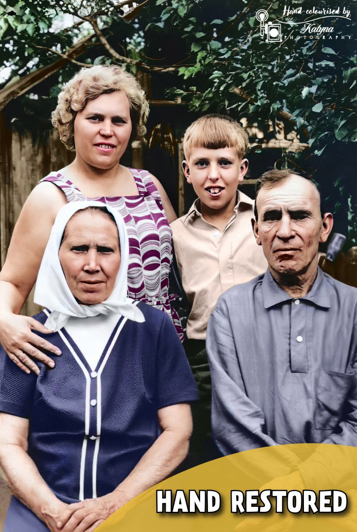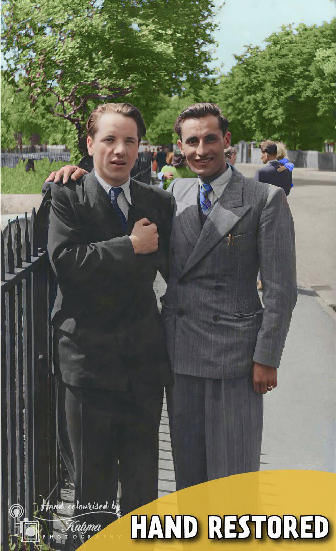 Transformation from the original monochrome image, an example of the AI automatic colourisation, to the hand-restored and hand-colourised end product