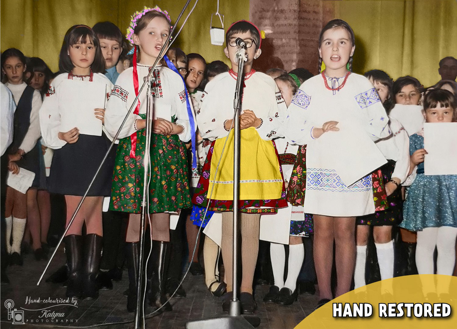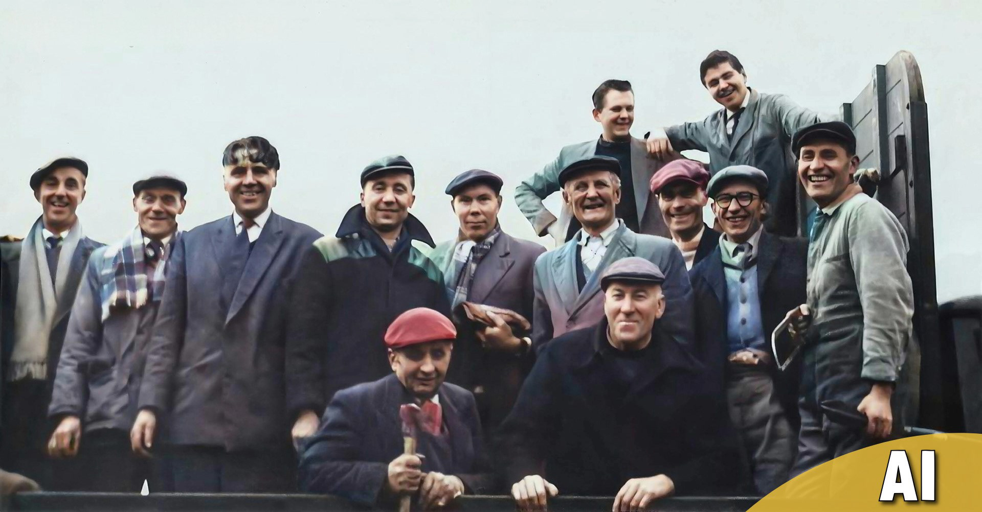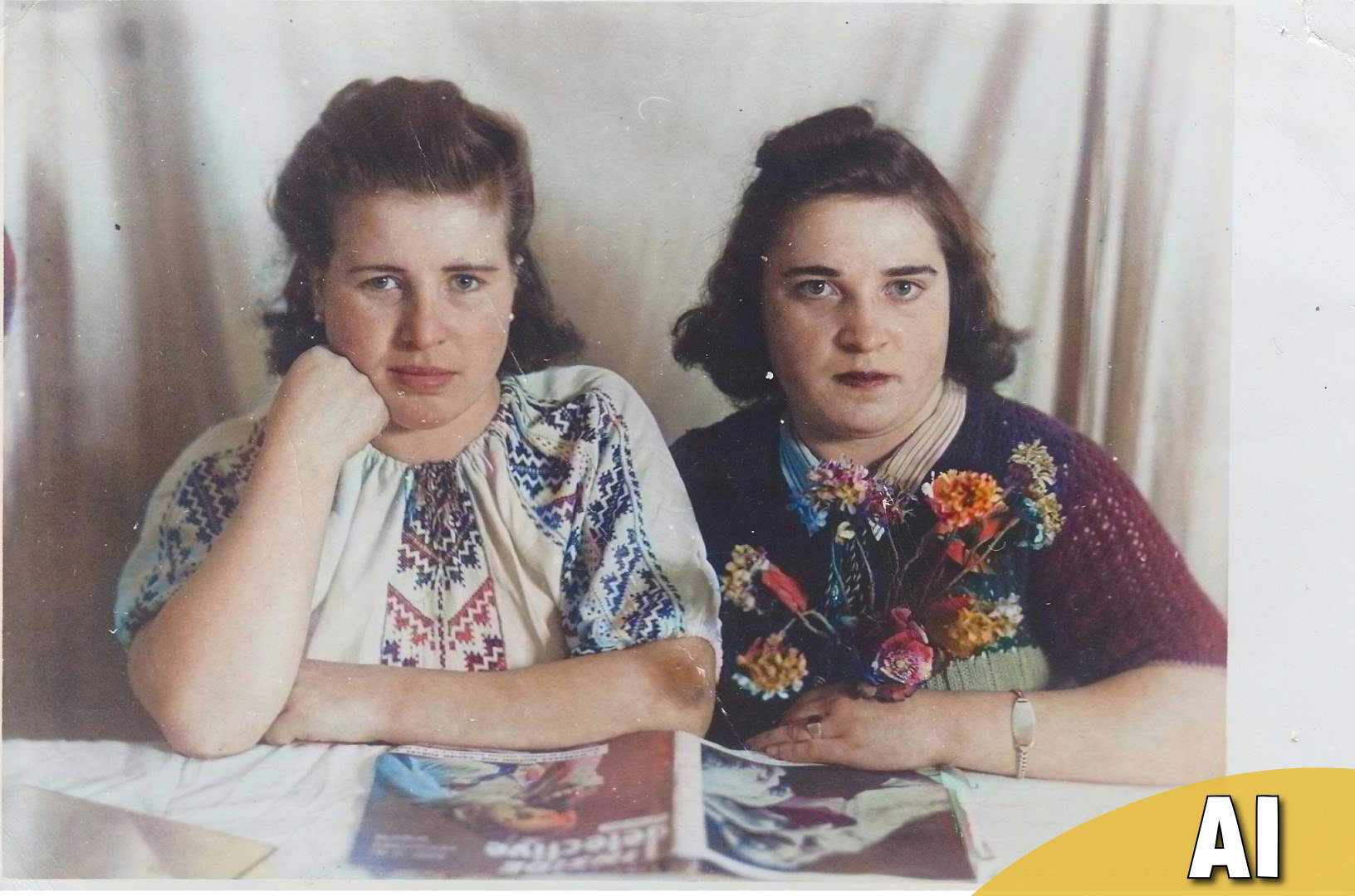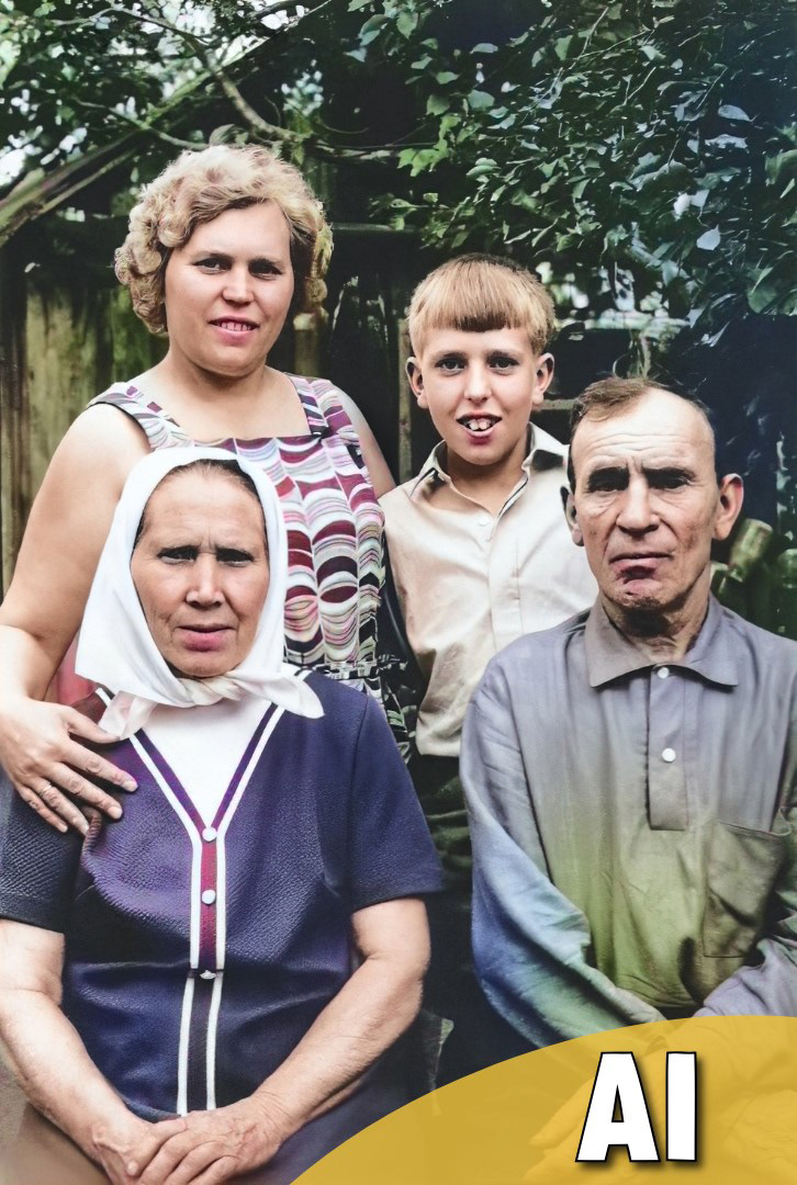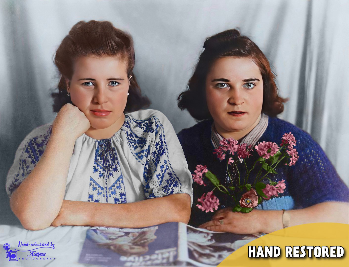 Transformation from the original monochrome image, an example of the AI automatic colourisation, to the hand-restored and hand-colourised end product