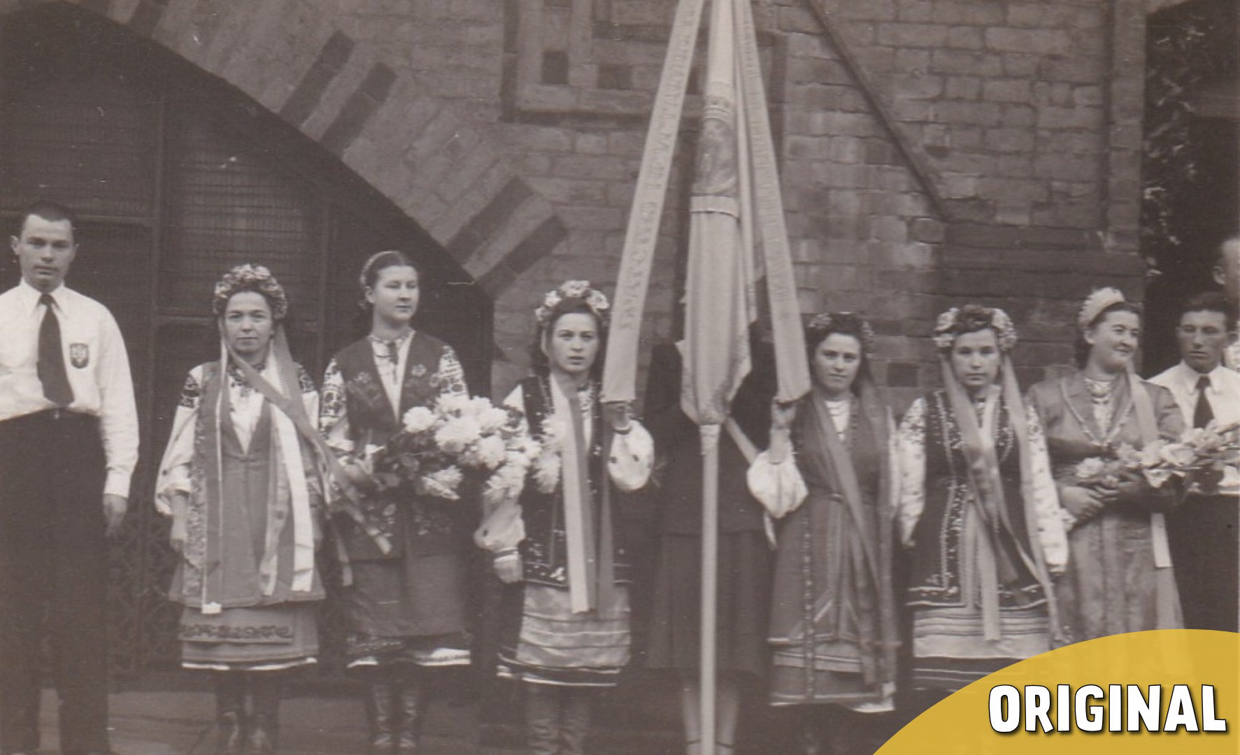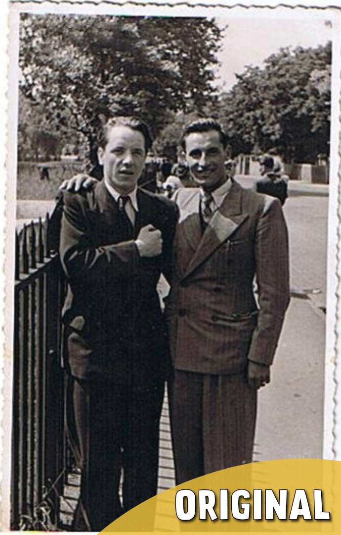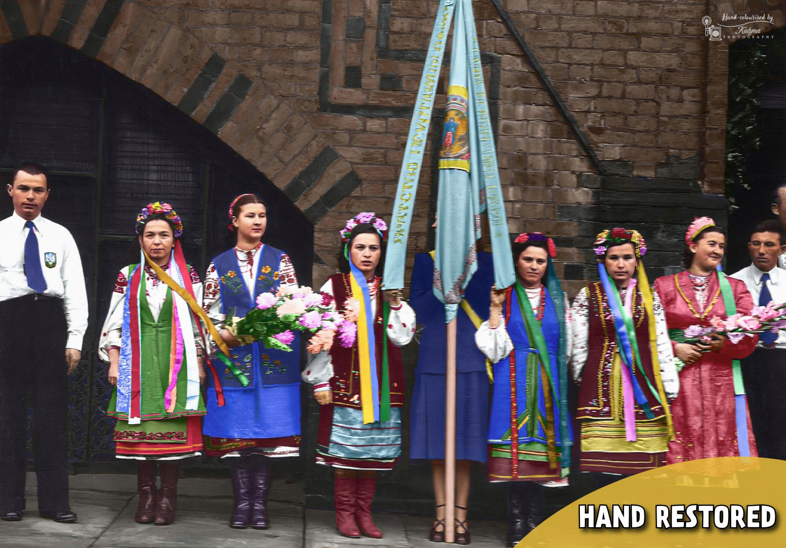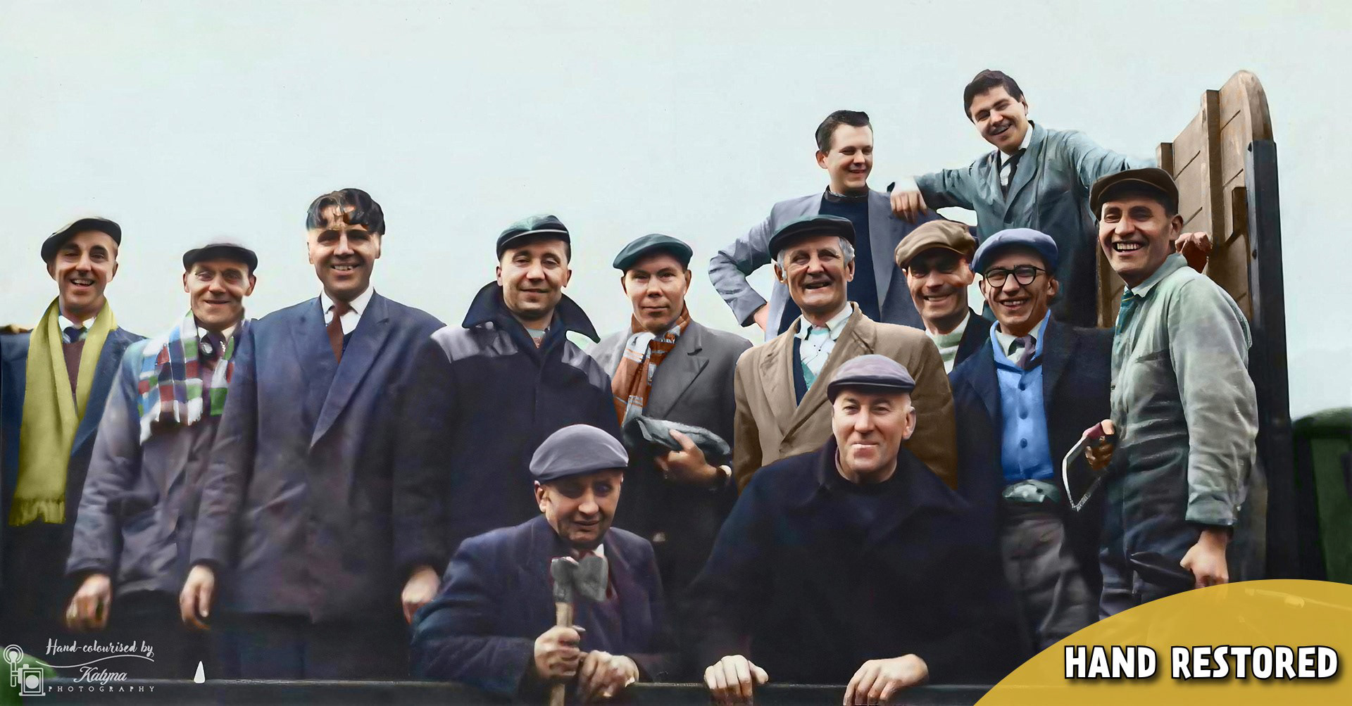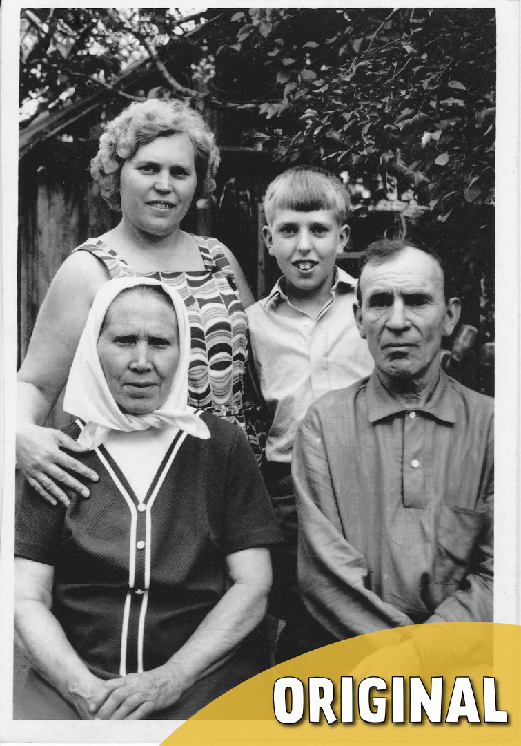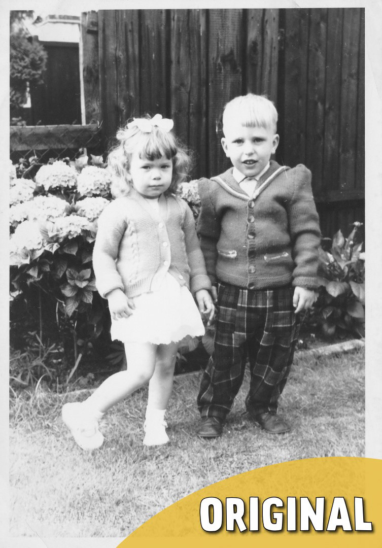 Transformation from the original monochrome image, an example of the AI automatic colourisation, to the hand-restored and hand-colourised end product
